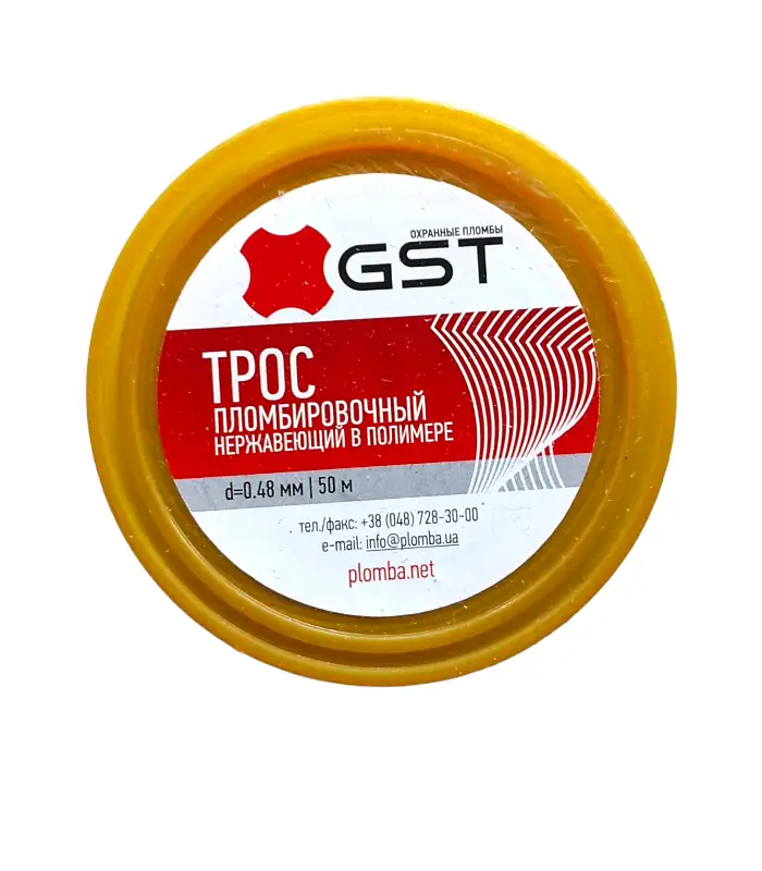 Трос пломбувальний нержавіючий  діаметром 0,48-0.65 мм у полімерній оболонці призначений для використання в умовах, де є підвищена вологість або агресивне середовище. Довжина троса в котушці становить 50 метрів.